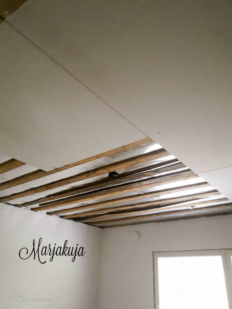 Ensin katosta poistettiin vanhat lastulevyt. Kattoa täytyi madaltaa, jotta saimme