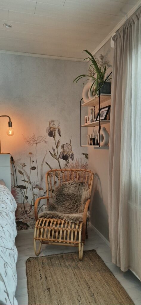 Kun rottinkituoli yhdistyy taljaan ja viherkasveihin, syntyy helposti rento ja lämmin tunnelma makuuhuoneeseen.
